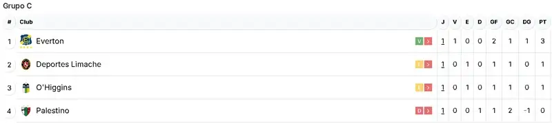 La primera fecha de la Copa de la Liga se cerró este lunes con la victoria por 2-1 de Everton sobre Palestino en La Cisterna, resultado con el que el cuadro viñamarino quedó como líder del Grupo C.